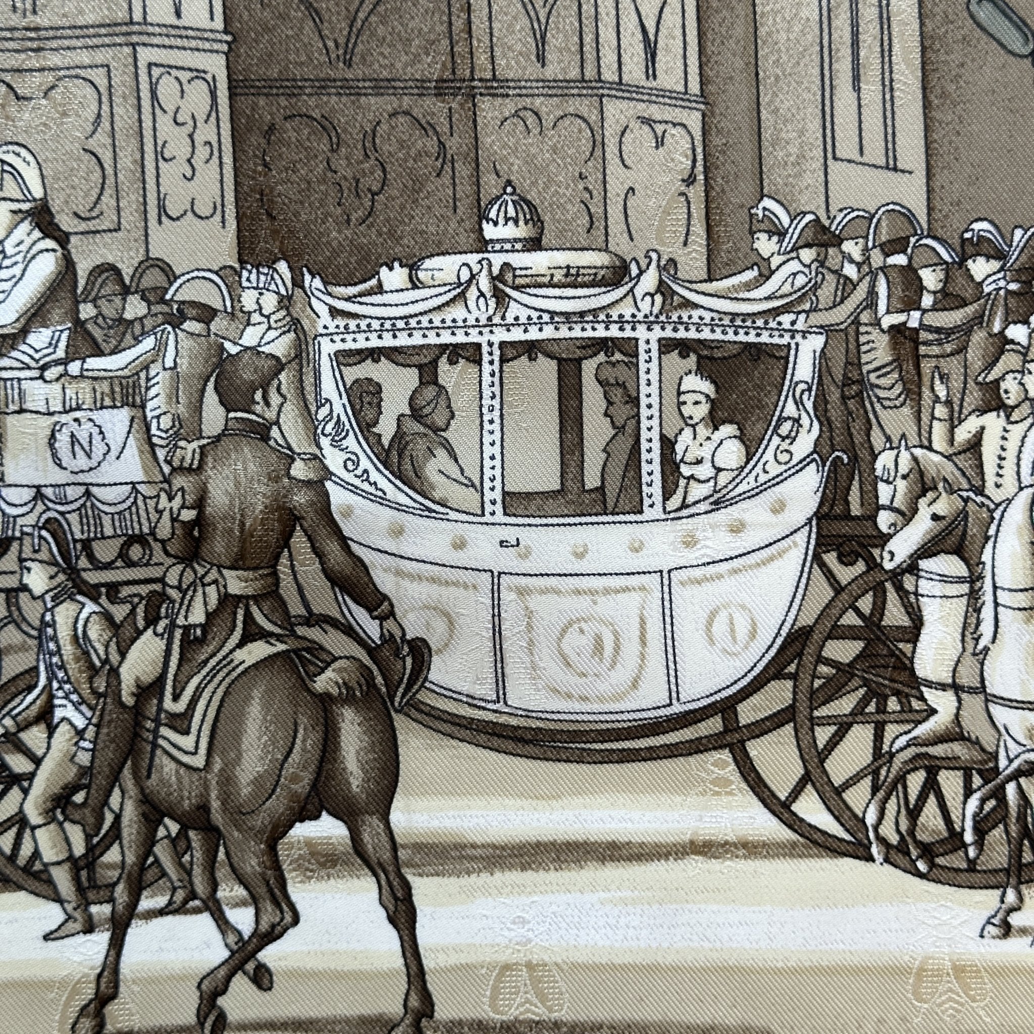 Avec Napoléon, Philippe Ledoux signe un carré spectaculaire et historique, mêlant grandeur impériale et exigence artistique. Chaque détail évoque le prestige de l’Empire : l’aigle, les abeilles, les drapeaux, et les décors militaires. Plus qu’un accessoire, ce carré est un fragment de récit, un hommage textile à l’une des figures les plus emblématiques de l’histoire de France. Sa réalisation en soie brochée en fait un carré à part, aussi rare et précieux.
